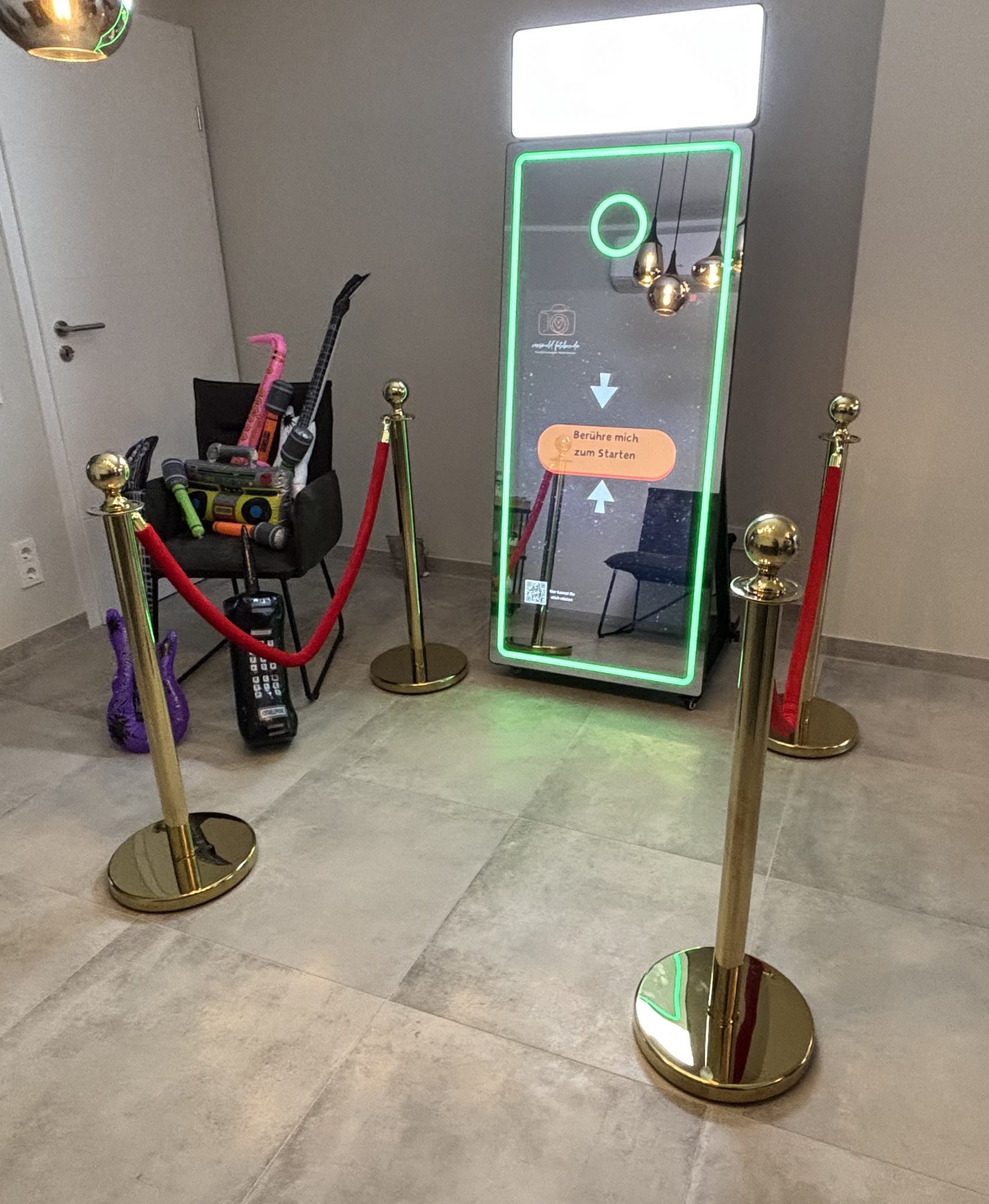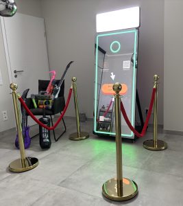 Nein. Der Spiegel braucht ca. 1,5 × 2 Meter freie Fläche inklusive Abstand für Gäste. Perfekt für Hochzeiten, Geburtstage und Firmenfeiern.